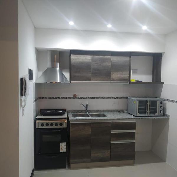 *Cocina completamente equipada, con artefacto de cocina a gas, campana, muebles bajo mesada y alacenas.