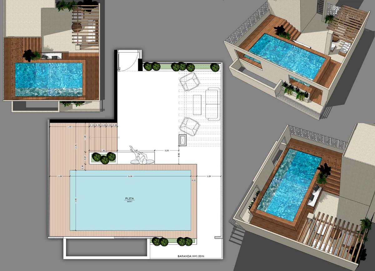 Hall de entrada en doble altura revestido en cerámica y detalles en mármol, full amenities, SUM en entrepiso, terraza con piscina y solarium, ascensor de velocidad variable, portón de acceso vehicular en acero con accionamiento a distancia.
