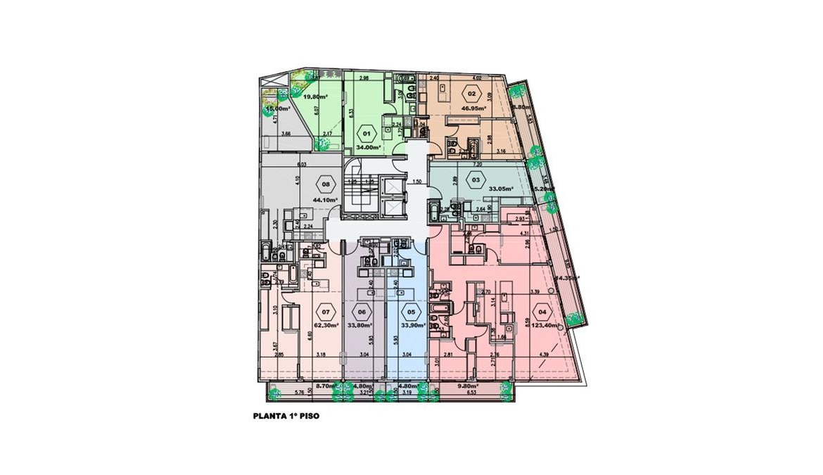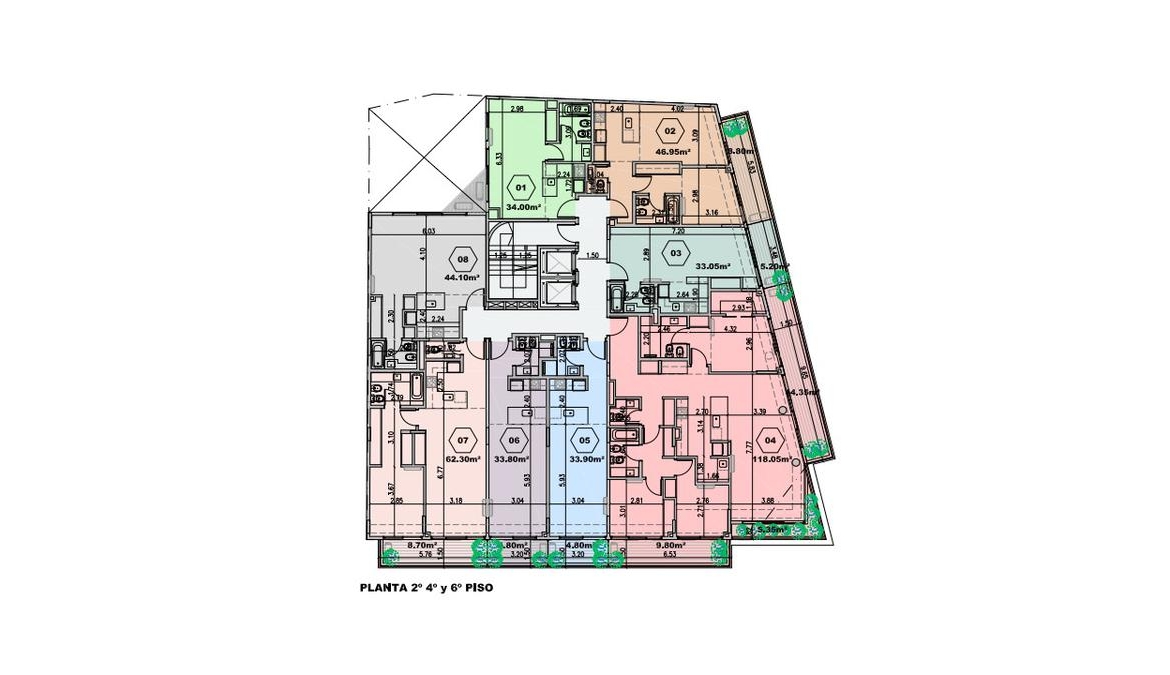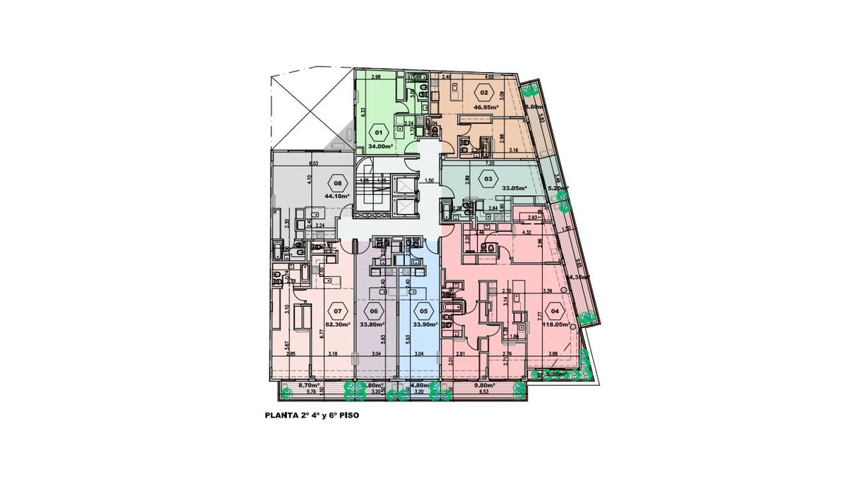 Las plantas contienen unidades de 1, 2, 3 y 4 ambientes con balcones hacia el frente.