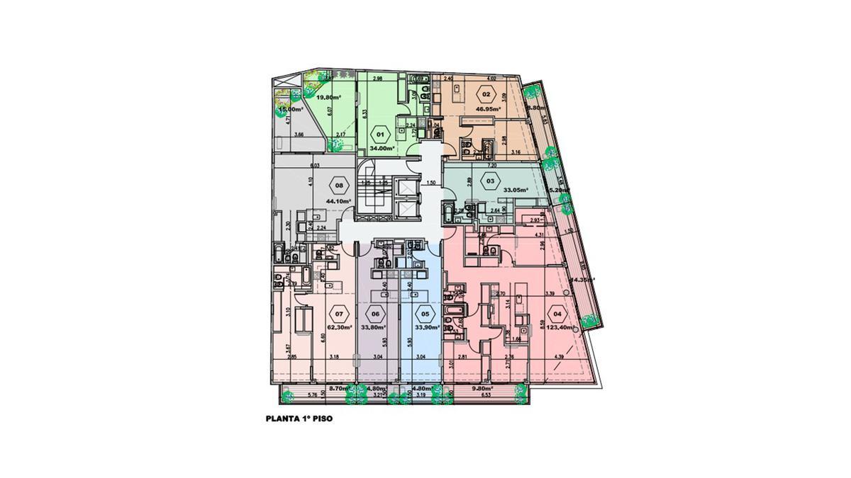 Las plantas contienen unidades de 1, 2, 3 y 4 ambientes con balcones hacia el frente.