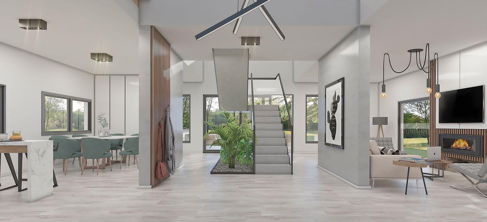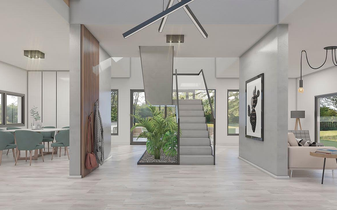 En Planta Baja, Importante hall de acceso con recibidor con doble altura, visuales hacia la piscina y escalera de acceso a Planta Alta. Amplia Cocina Semi Integrada al Comedor, Estudio orientado Al Frente, baño completo, Estar con vistas al parque y hogar a leña.