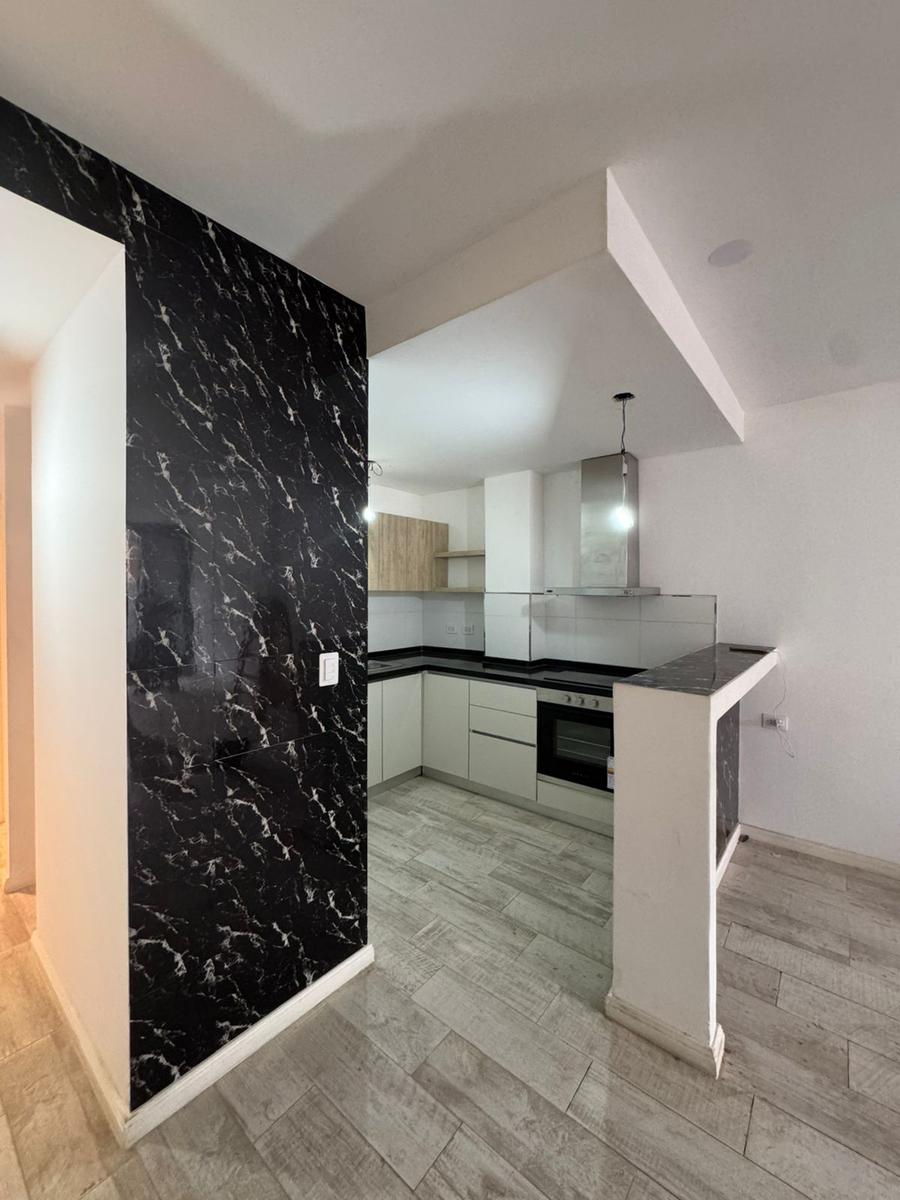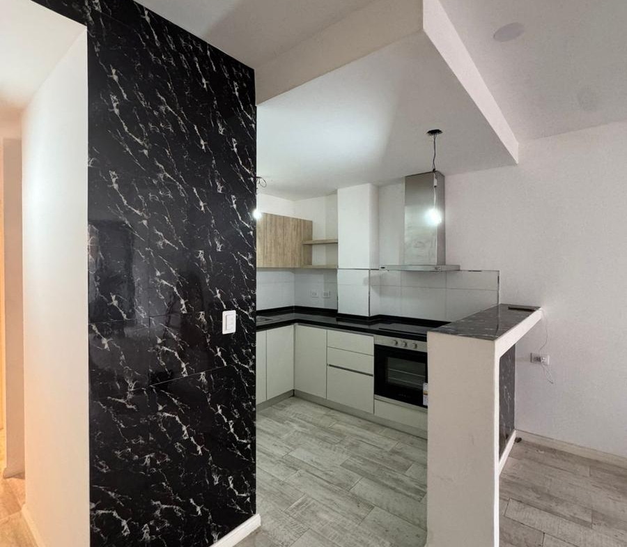 * Cocina completa con muebles bajo mesada y alacenas, barra desayunadora, mesada de mármol color negro.
