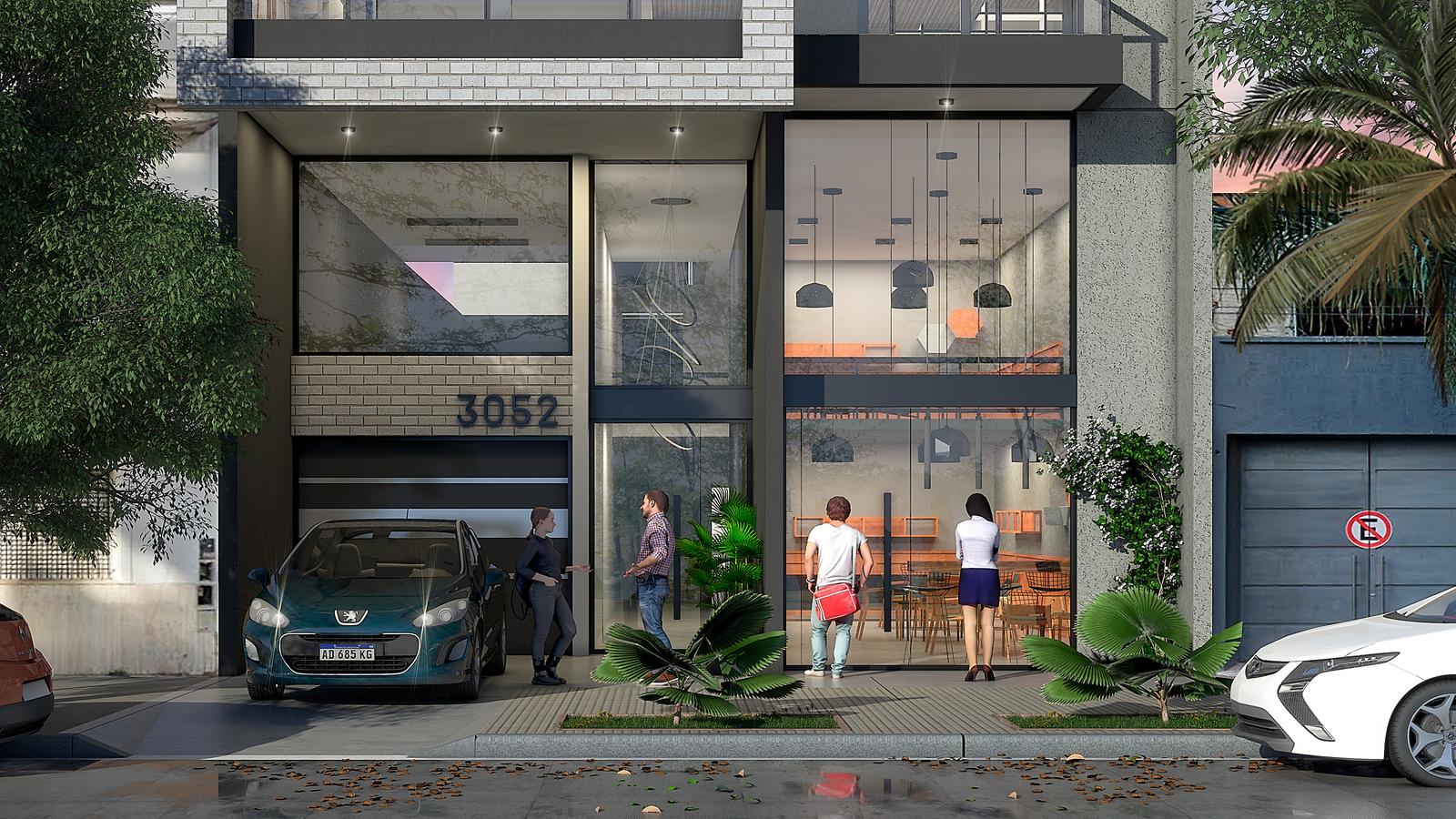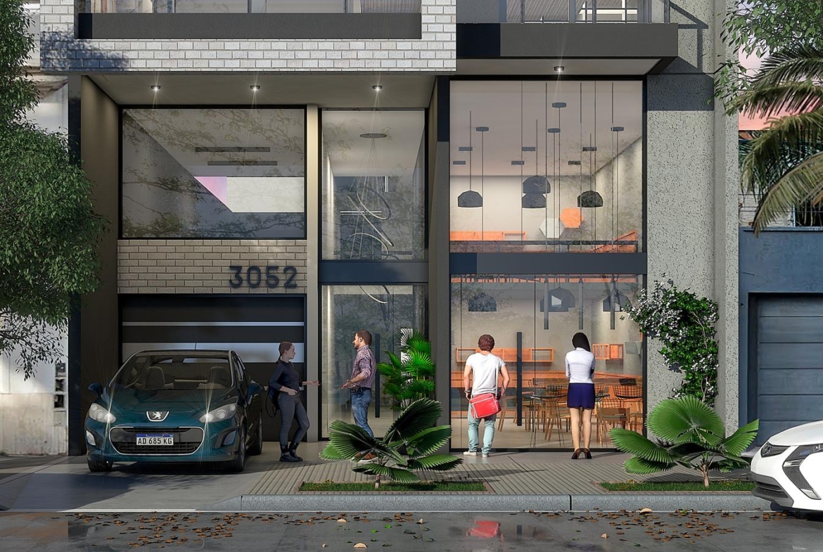 Planta baja con acceso jerarquizado y gran frente vidriado que aporta luminosidad y categoría.