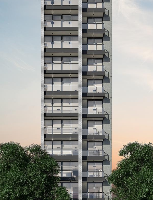 Este edificio se desarrolla en 11 niveles, con un diseño sobrio y elegante que resalta en la cuadra gracias a su fachada de líneas rectas, amplios balcones vidriados y detalles en hormigón visto y ladrillo a la vista.
