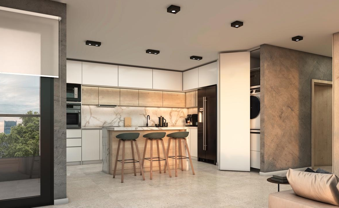 * 3 habitaciones, una de ellas principal en suite con vestidor y balcón privado.* Baño completo adicional + toilette de recepción.* Espacioso living comedor integrado con salida a un balcón corrido al frente, generando una excelente luminosidad y ventilación.* Cocina integrada de diseño, con isla central, muebles bajo mesada y alacenas, ideal para quienes disfrutan cocinar y compartir.* Espacio independiente de laundry, pensado para mantener la organización del hogar.