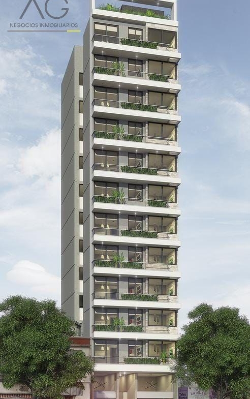 Edificio de estilo moderno, hall de entrada en doble altura, local comercial en planta baja, ascensor de última generación revestido en acero, dos niveles de cocheras, SUM y terraza de uso común.
