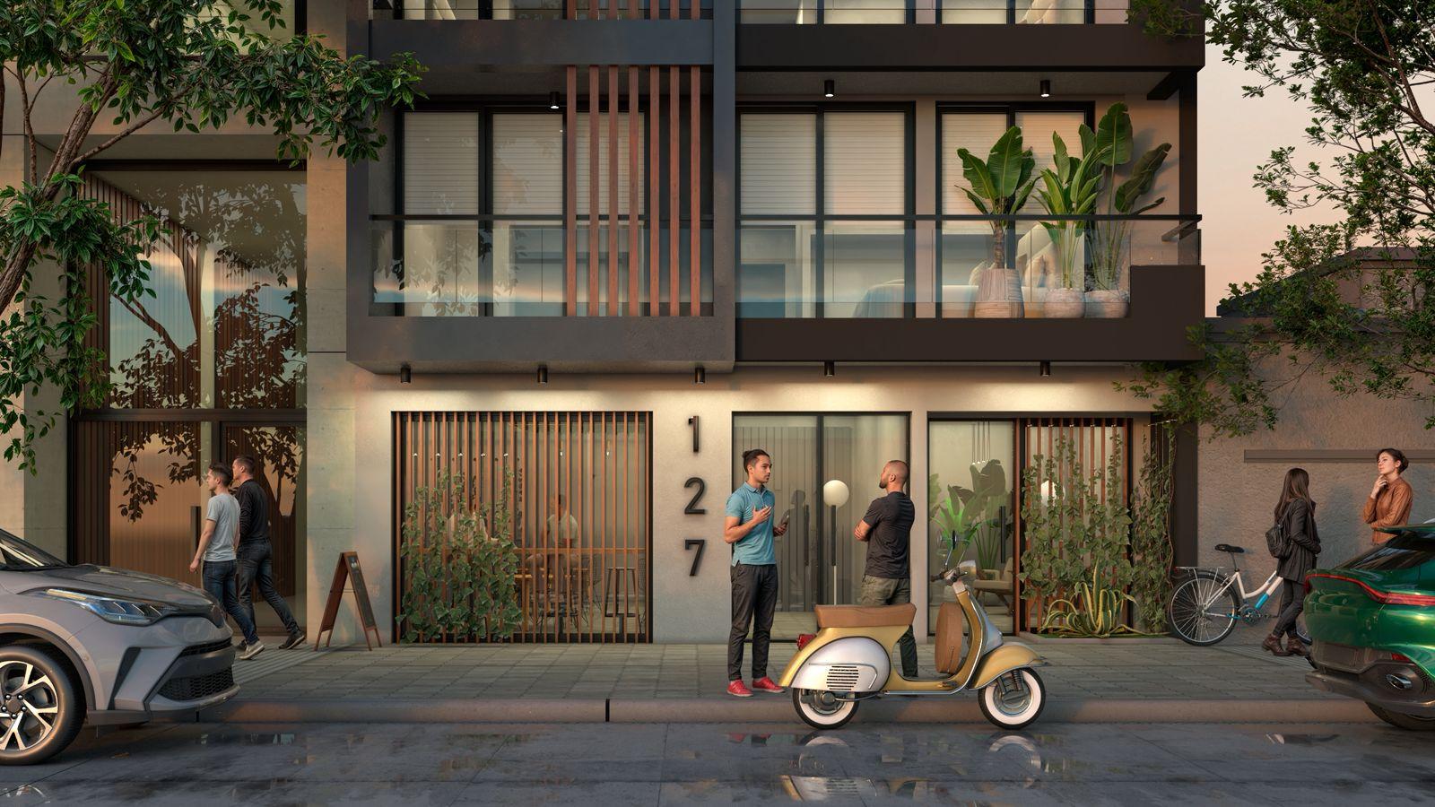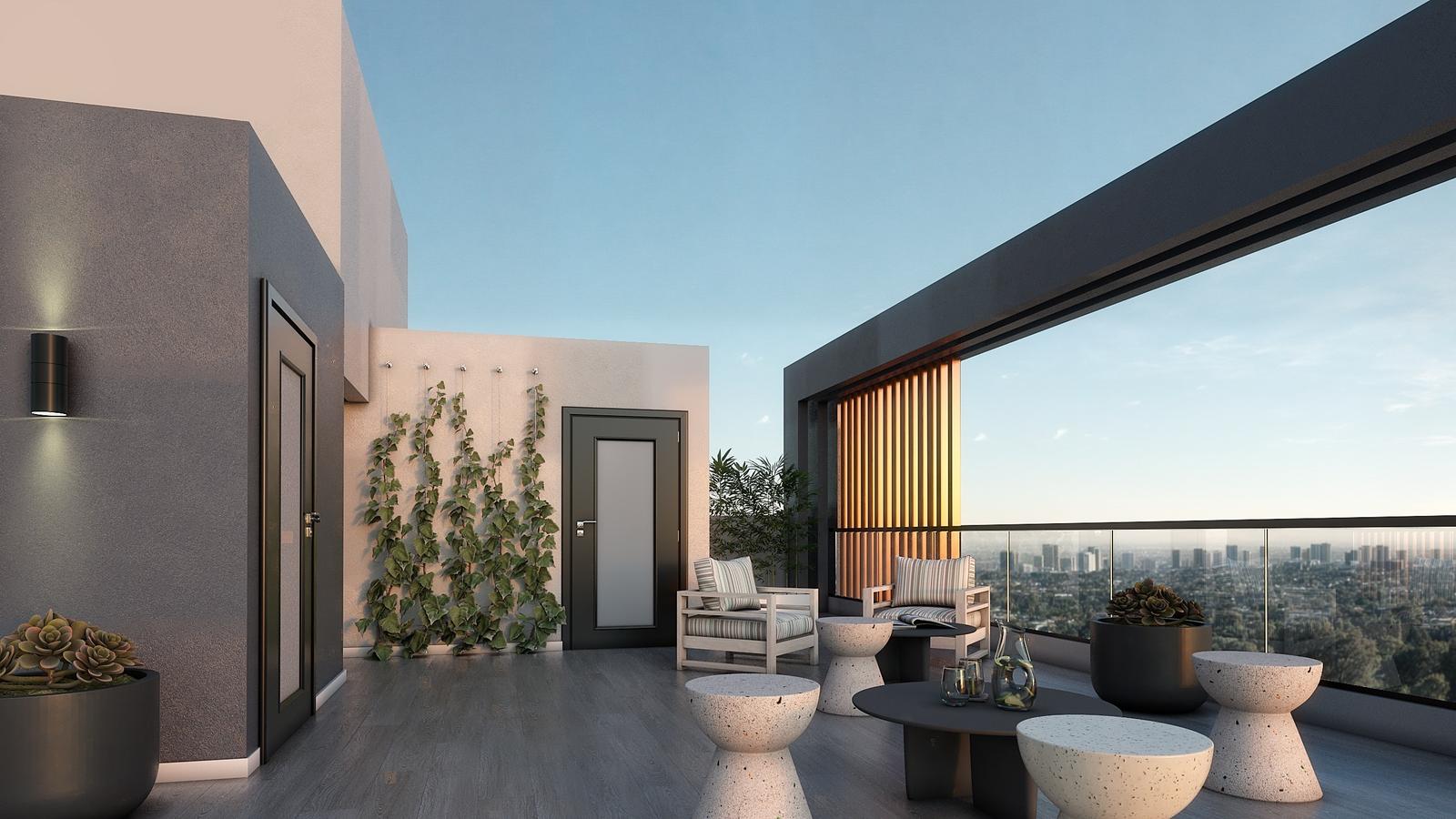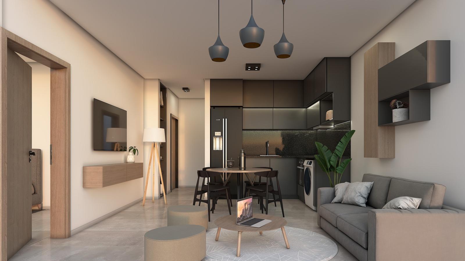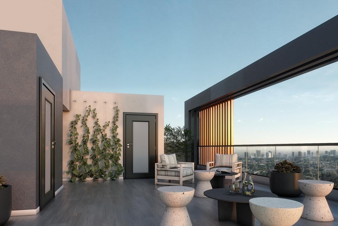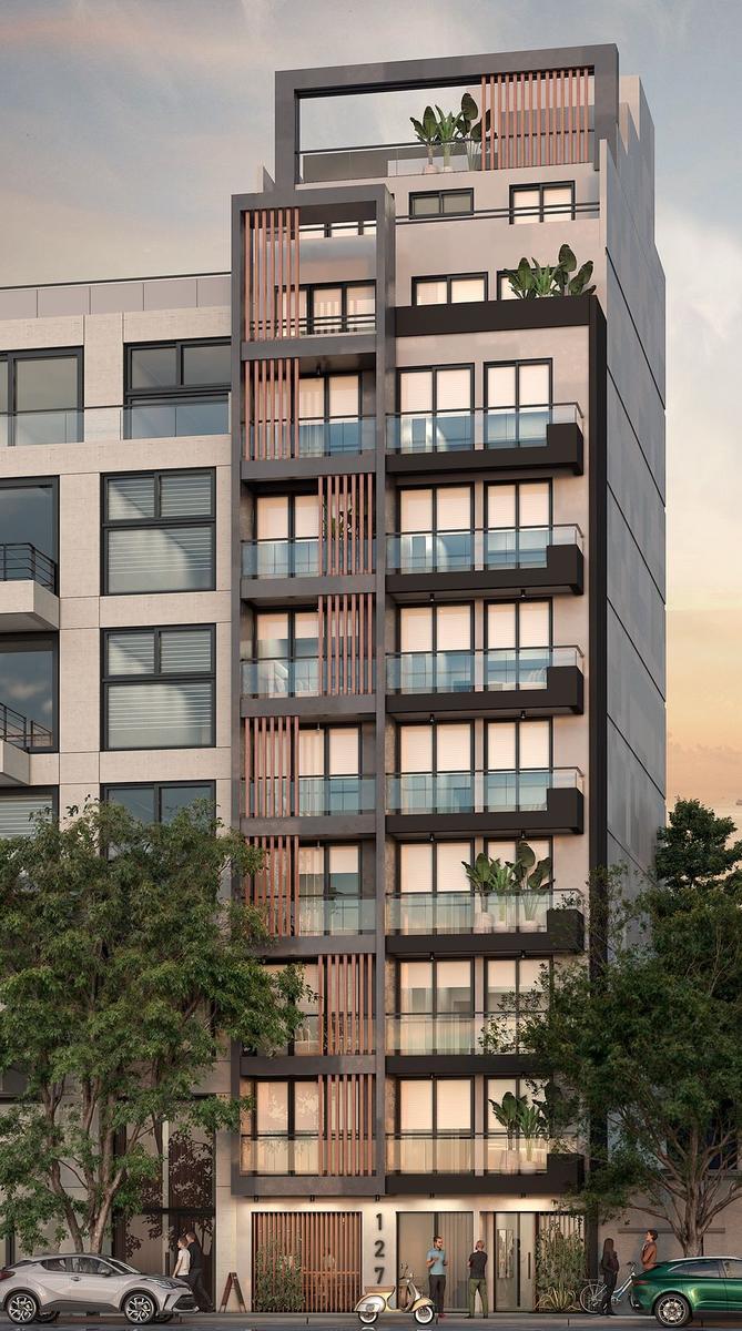 Edificio de 9 pisos con unidades monoambientes al frente y dos ambientes, local comercial en planta baja, ascensor de última generación revestido en acero y vidrio, amplia terraza de uso común con sector de parrillas, solárium y piscina.